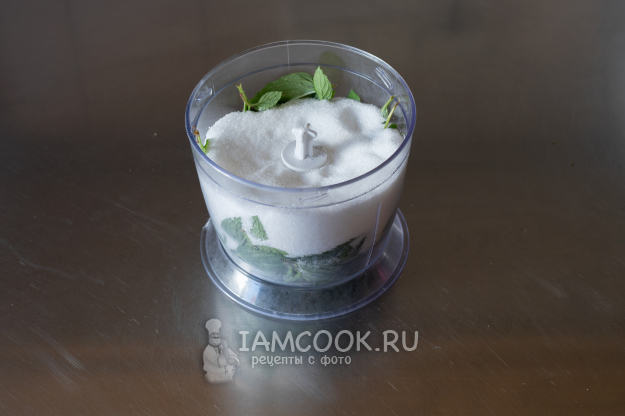 Вниз ёмкости чоппера или кухонного комбайна помещаем листья мяты. Сверху сыплем сахар. Именно в таком порядке.