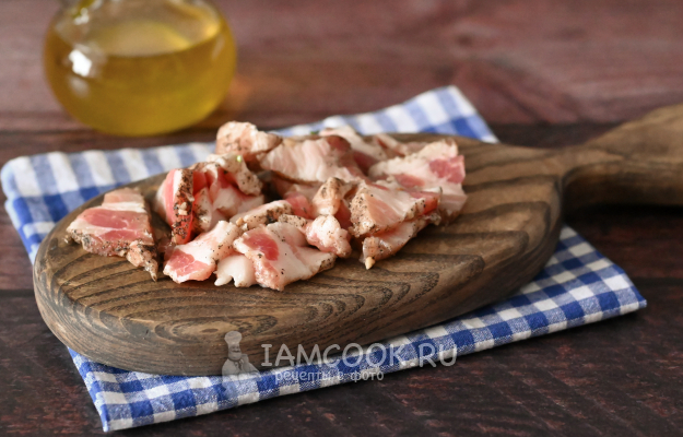 Нарежьте сало тонкими пластинками. Чтобы это было легче сделать, сало можно чуть подморозить.