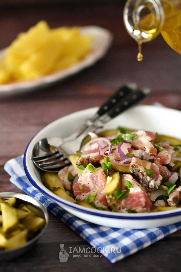 Про выбор сала. Идеально, если это будет сало, засоленное в рассоле, - оно более сочное и для салата подходит лучше всего. Можно и сухого посола, но тогда берите сало умеренной соли. Копчёное и сваренное в шелухе, на мой взгляд, не подойдёт (но это только на мой). Идеально, если сало будет с прослойками.