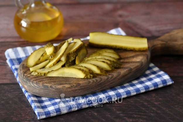 Солёные огурцы разрежьте вдоль и затем нарежьте слегка наискосок.
