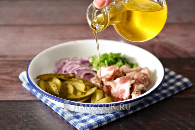 Теперь сложите все нарезанные ингредиенты в миску и слегка сбрызните подсолнечным маслом. Масла много не нужно, достаточно одной-двух ложек, чтобы просто объединить все ингредиенты и усилить их вкус.