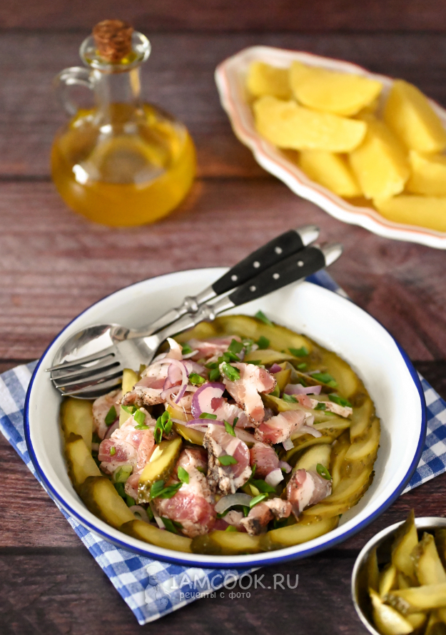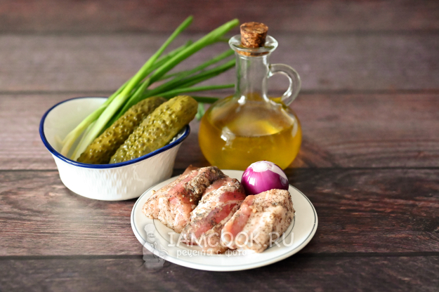Вот такой набор продуктов понадобится для приготовления салата из сала и солёных огурцов.