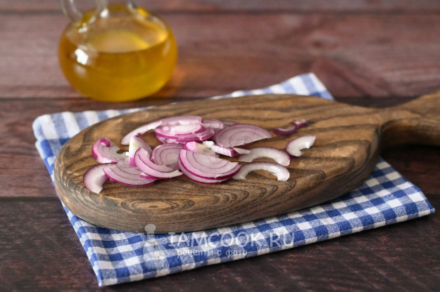 Репчатый лук нарежьте тонкими полукольцами.