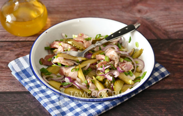 Теперь всё перемешайте, и салат из сала и солёных огурцов готов!