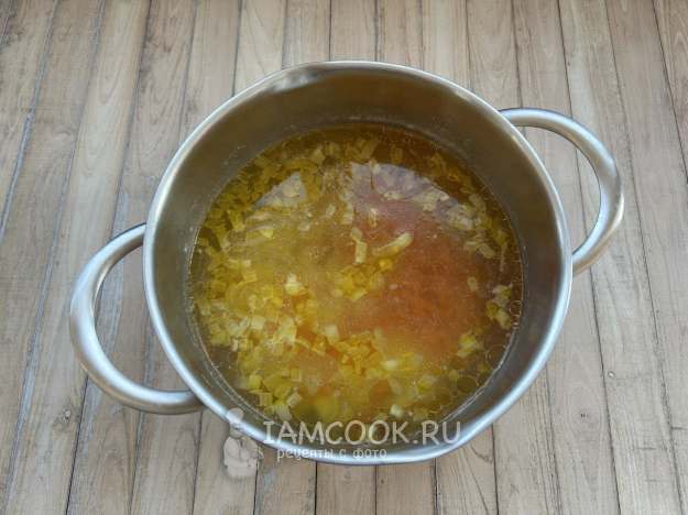 Положите обжаренные овощи в горячий бульон вместе с нарезанным мясом и картошкой. Варите на среднем огне 7-10 минут, до мягкости картофеля.