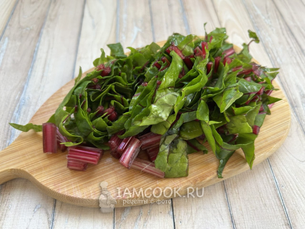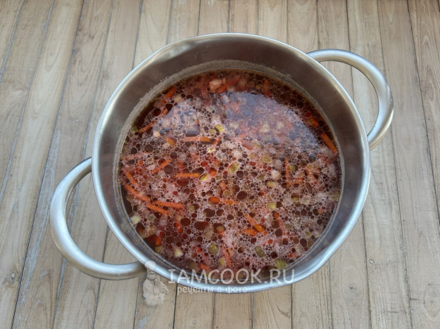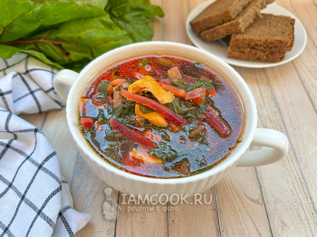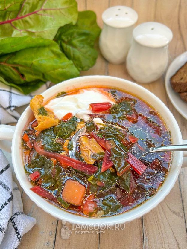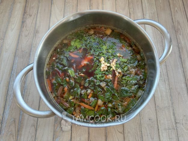 Свекольную ботву промойте и нарежьте. Добавьте ботву в суп и варите еще 5 минут. Попробуйте бульон на вкус, при необходимости подсолите.