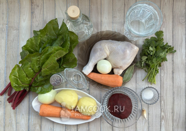 Соберите по списку все необходимые ингредиенты для приготовления горячей ботвиньи с мясом.