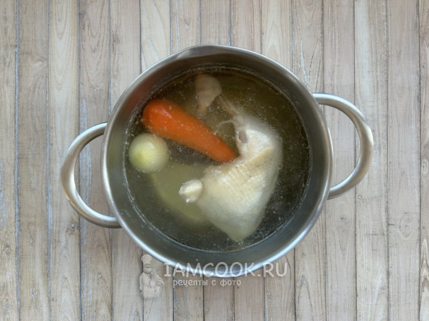 Промойте куриный окорочок холодной водой и положите его в кастрюлю с кипящей водой. Добавьте соль, лавровый лист, одну луковицу и морковь. Варите мясо около 30 минут на среднем огне, пока оно не станет мягким. Из готового бульона выньте куриный окорочок и дайте остыть.