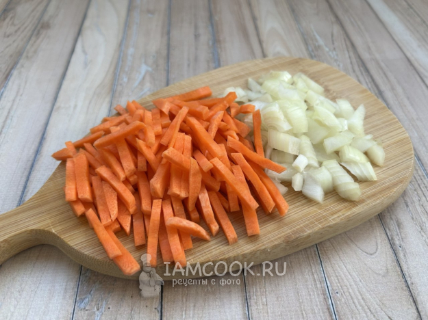 Очистите картофель, морковь и репчатый лук. Морковь нарежьте тонкой соломкой или натрите на крупной терке, половину луковицы мелко порубите.