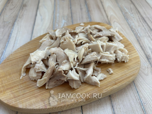 Отделите мясо от костей, снимите шкуру и нарежьте небольшими кусочками.