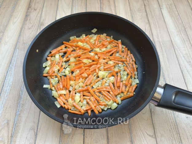 Обжарьте овощи на растительном масле до золотистого цвета.