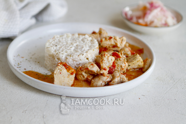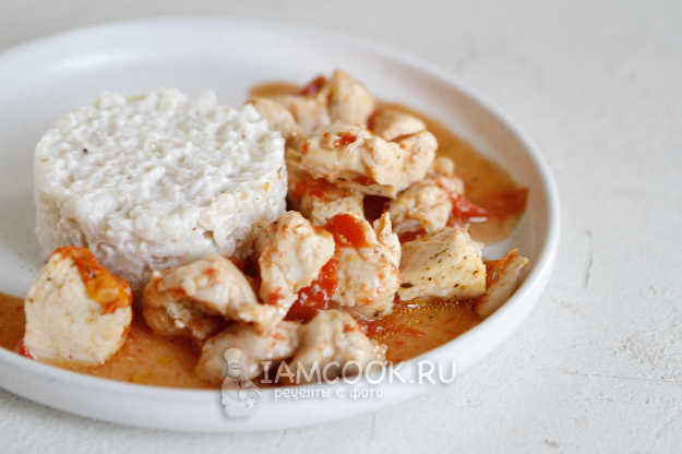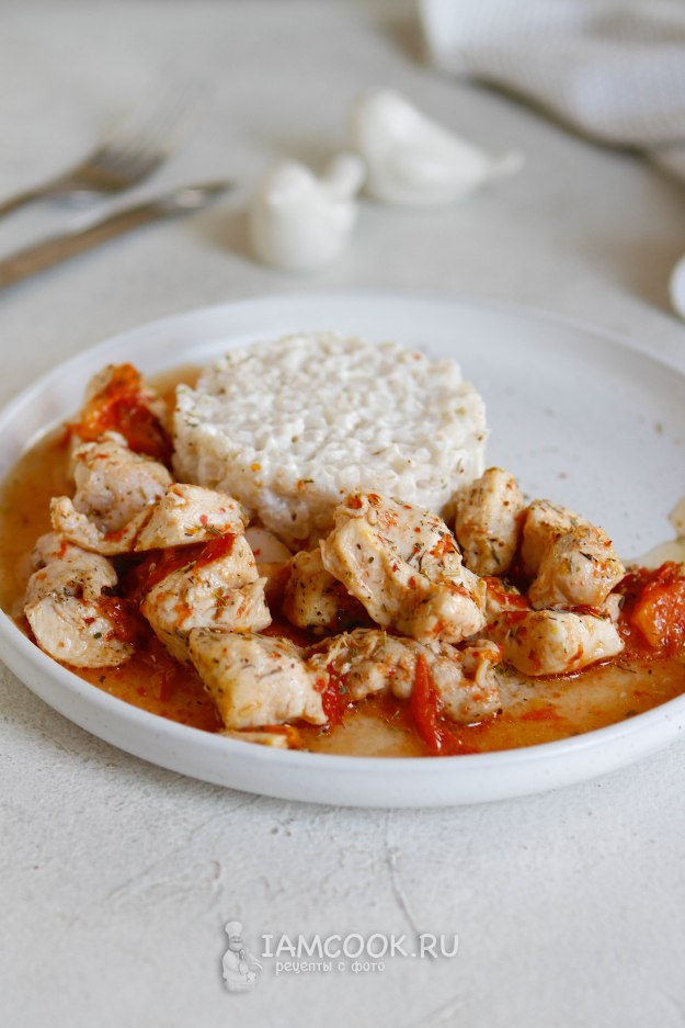 Подавайте курицу с помидорами с любым гарниром. Будет вкусно с картофельным пюре, рисом или гречкой. Я же подавала с перловкой. А готовила я ее вот по этому рецепту.