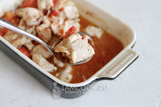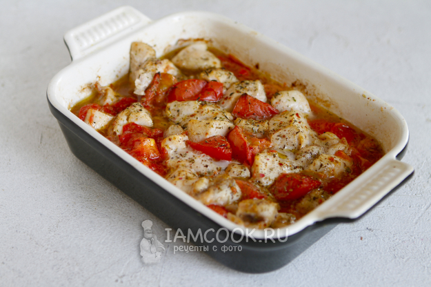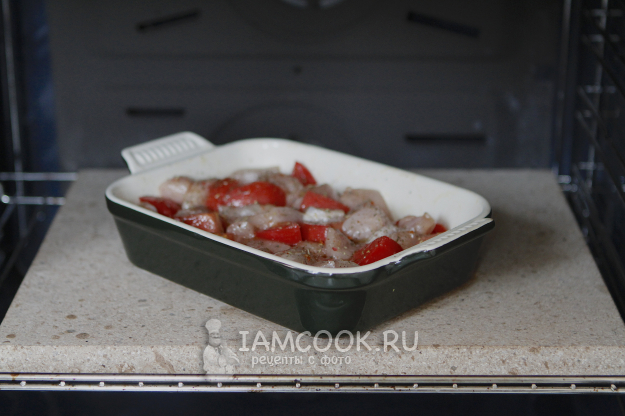 Я готовила кусочки курицы с помидорами в духовке 30 минут при 180 градусах, выставив режим "Верх/Низ" с конвекцией.