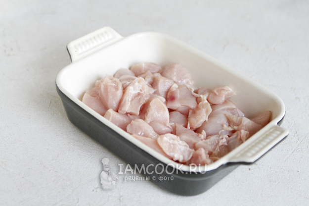 Грудку необходимо промыть под проточной водой и обсушить бумажным полотенцем. Нарежьте грудку на кусочки примерно 1.5х1.5 см. Чтобы не пачкать лишнюю посуду, по мере подготовки ингредиентов, сразу перекладывайте их в форму для запекания.