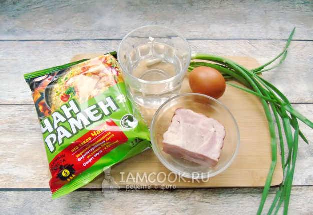 Соберите ингредиенты для приготовления рамена с ветчиной.