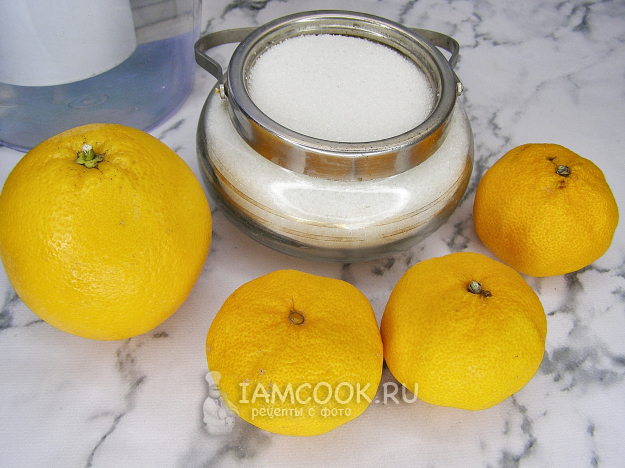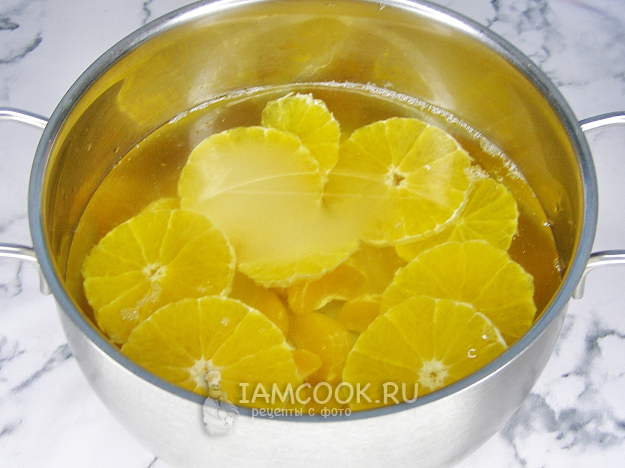 С апельсина счищаем белую часть и нарезаем его кружочками или дольками. Перекладываем в воду с мандаринами, добавляем сахар и ставим на огонь. После закипания варим на медленном огне 5 минут, снимаем с огня и оставляем остывать.