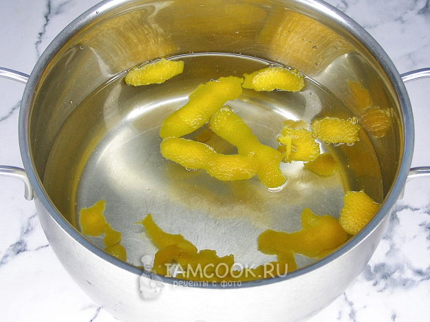 Апельсин тщательно моем горячей водой, затем аккуратно счищаем с него цедру, не затрагивая белую часть, так как она может горчить. Перекладываем цедру в кастрюлю, заливаем холодной водой и ставим на сильный огонь. Доводим до кипения, после закипания уменьшаем огонь и варим 5 минут.