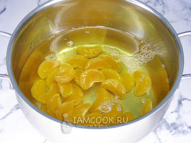 Мандарины очищаем от кожуры, разбираем на дольки, а с долек снимаем белые прожилки. Очищенные дольки кладём в кастрюлю с апельсиновой водой.
