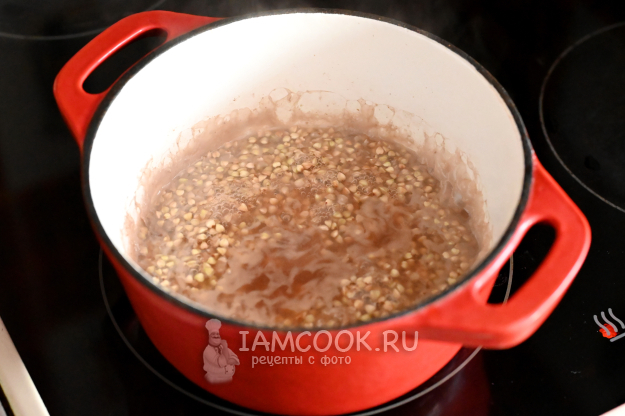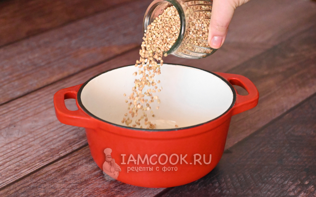 А пока тыква запекается, сварим зелёную гречку. Всыпьте гречневую крупу в кастрюлю.