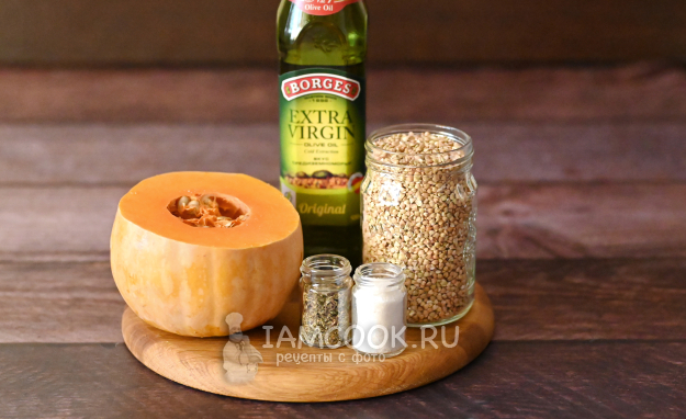 Соберите необходимые продукты для приготовления зелёной гречки с тыквой.