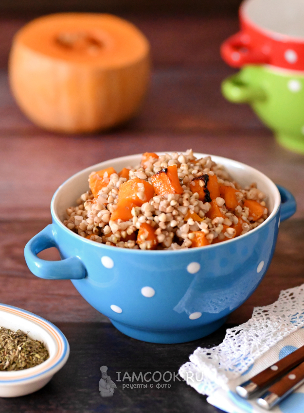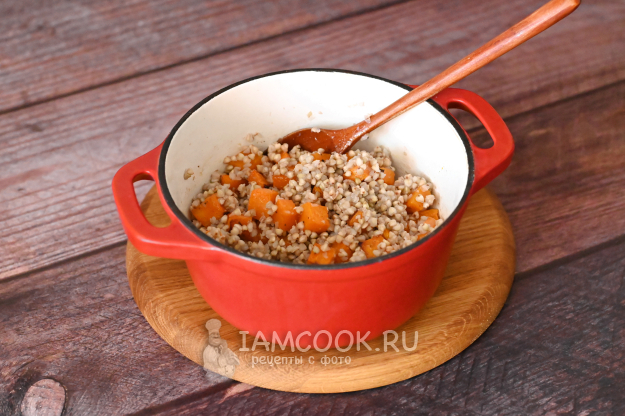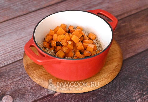 К готовой зелёной гречке выложите горячую запечённую тыкву, обязательно вылейте сюда всё масло и сок, которые будут на дне противня.