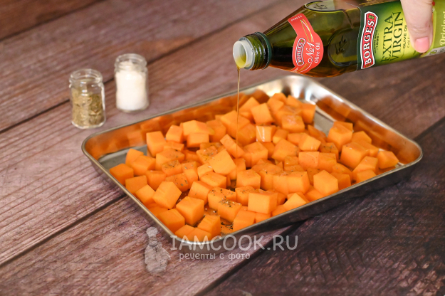 Выложите кубики тыквы на противень, приправьте солью и сушеным орегано, сбрызните оливковым (или любым другим растительным) маслом.