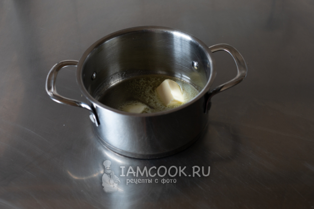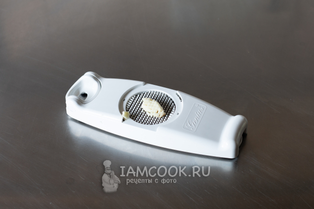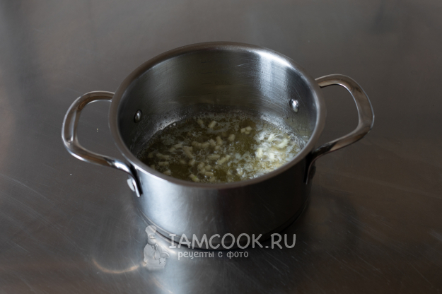 Когда масло растопится, обжарим в нём чеснок секунд 30 (продолжая резать кольраби).