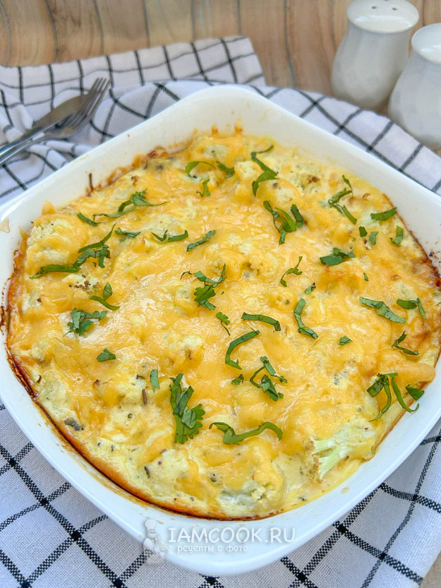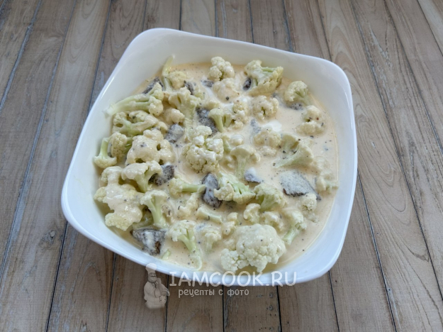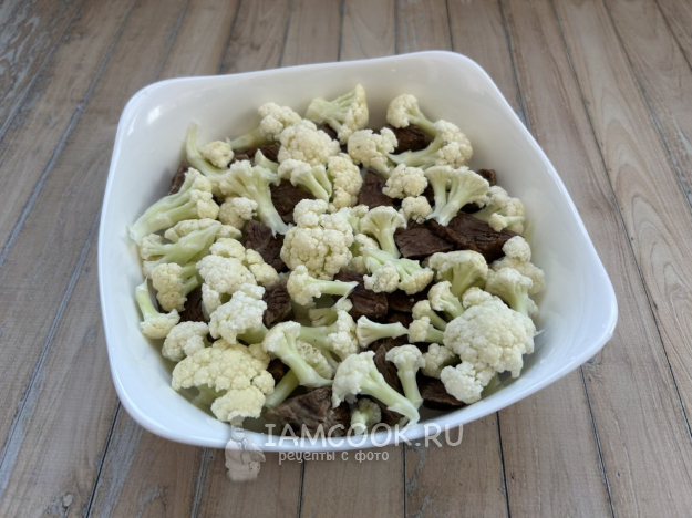 Цветную капусту разделите на соцветия. Сложите в смазанную растительным маслом форму для запекания мясо с цветной капустой.