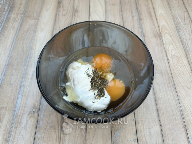 Смешайте вилкой сметану с яйцами, сушеным базиликом и карри, посолите и добавьте черный молотый перец по вкусу.