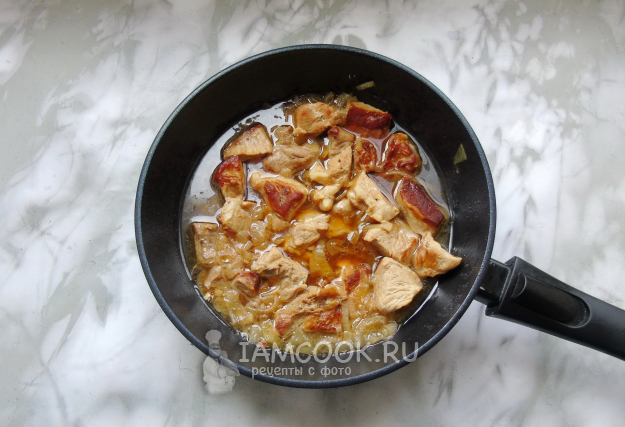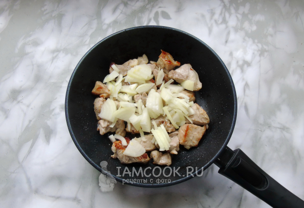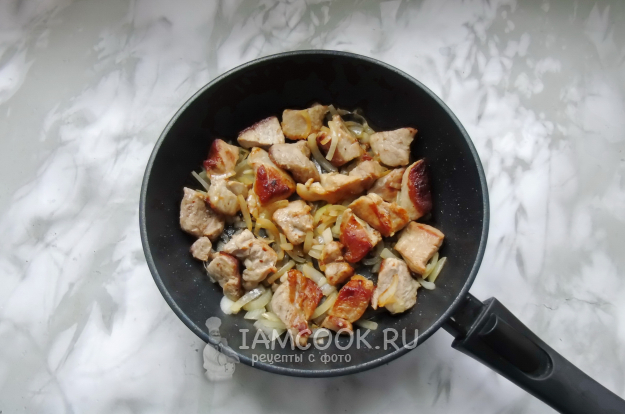 Жарьте мясо с луком, перемешивая, 7-8 минут.