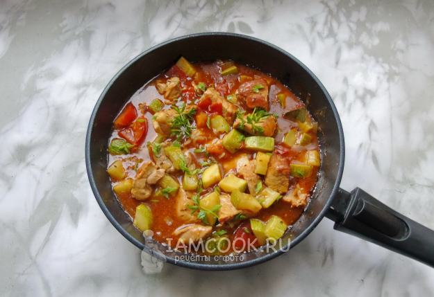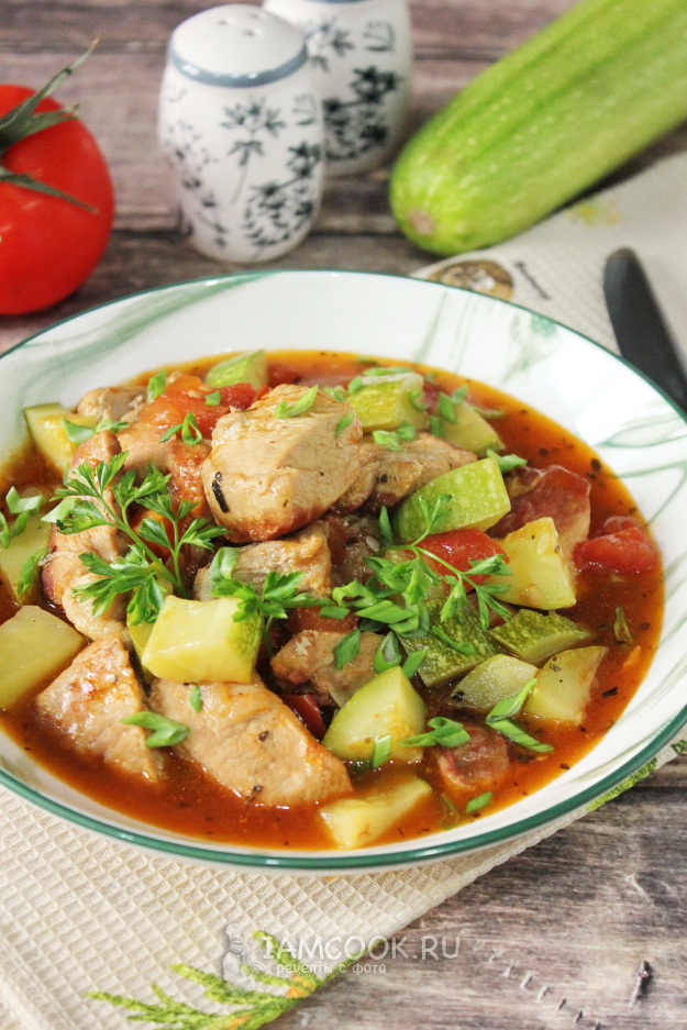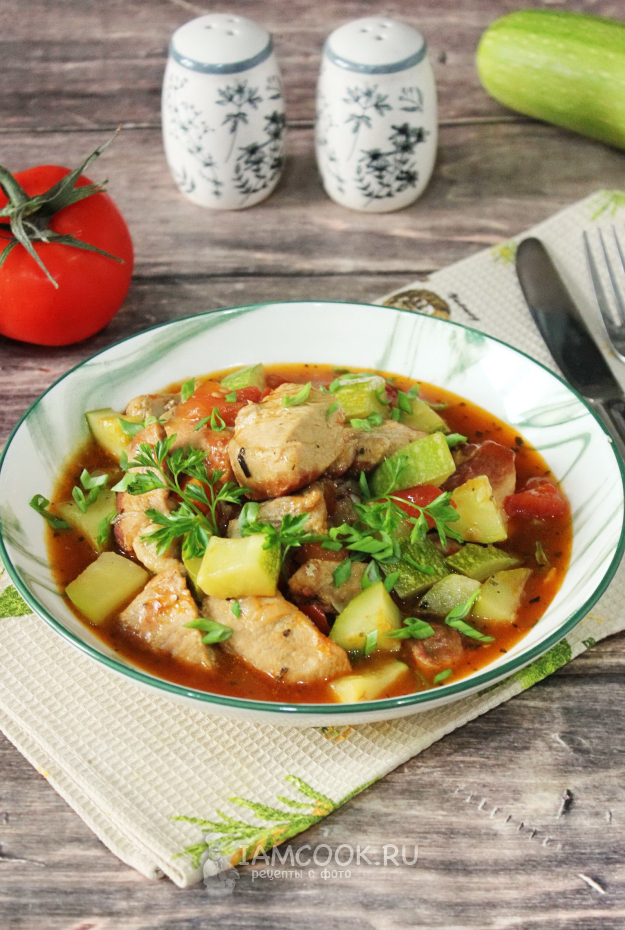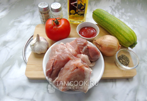 Соберите ингредиенты для приготовления свинины с кабачком и помидорами.