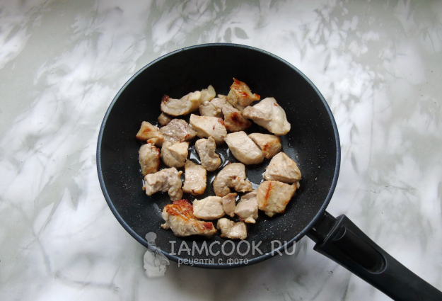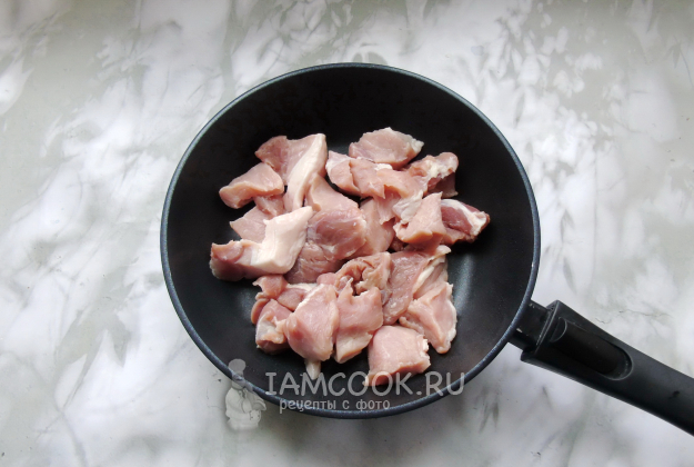 Свинину помойте и нарежьте небольшими кусочками. Выложите на горячую сковороду с растительным маслом.