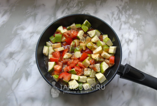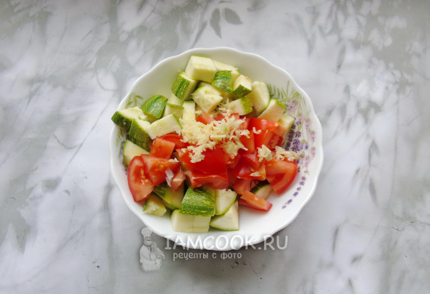 Тем временем помидоры и кабачок нарежьте кубиками. Чеснок измельчите любым способом.