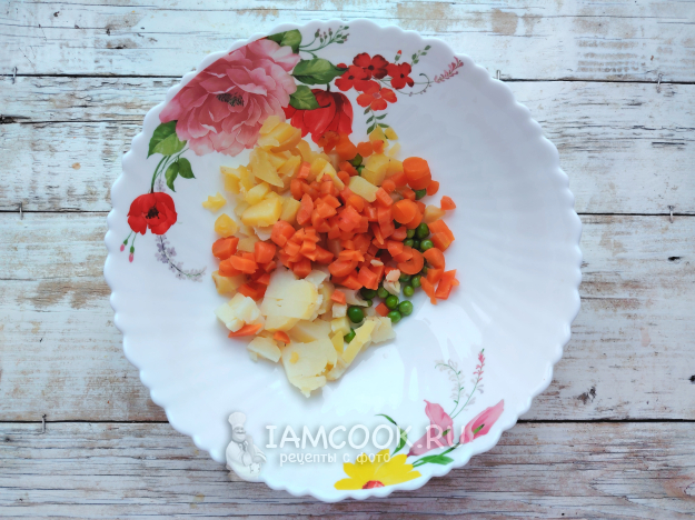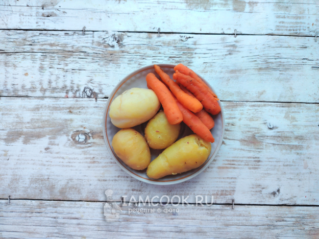 Овощи отварить в мундире, остудить, почистить.