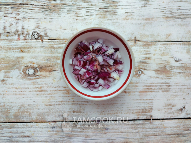 Лук мелко порубить ножом, залить смесью из горячей воды и уксуса, оставить на 15 минут.