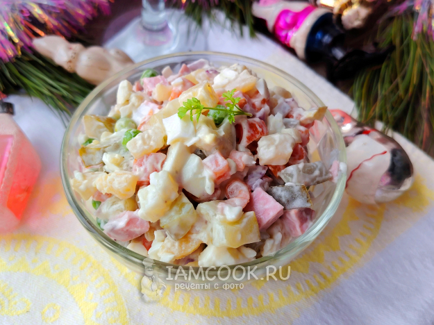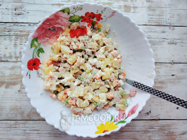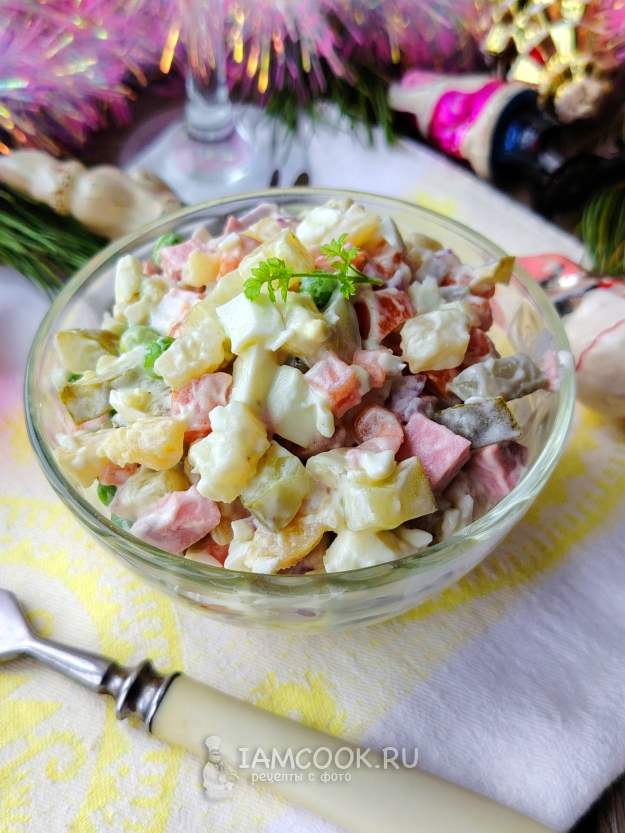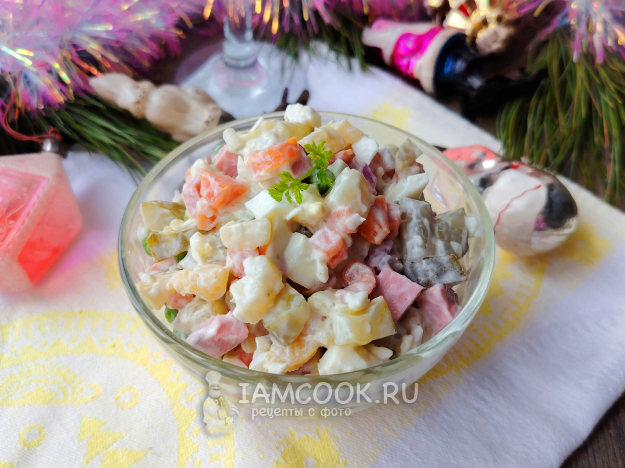 Салат Оливье с сосисками и маринованным луком готов.