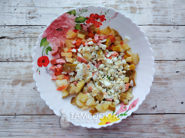 Следом в салатник отправляются таким же образом нарезанные сосиски.
