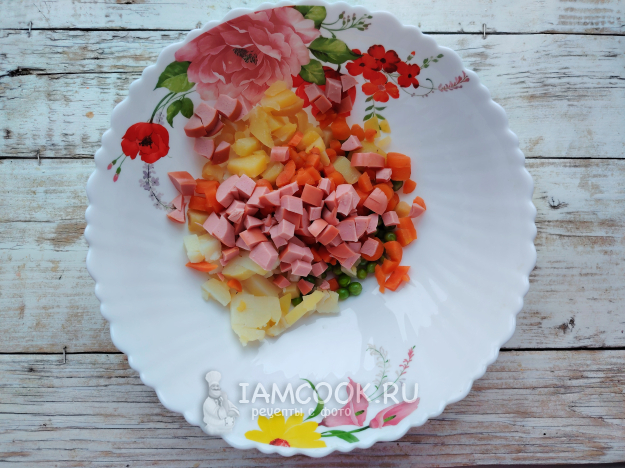 Собрать по списку продукты для салата Оливье с сосисками и маринованным луком. Этот салат отличался от традиционного (с колбасой) использованием сосисок, хотя по вкусу разница не ощутима. Главное, чтобы они не содержали каких-либо вкусовых добавок.