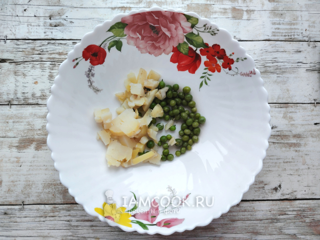 Картофель нарезать кубиками, с горошком отправить в глубокий салатник.