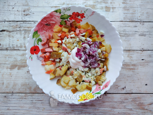 Из миски с луком слить жидкость. Лук, специи и майонез добавить в салат.
