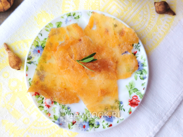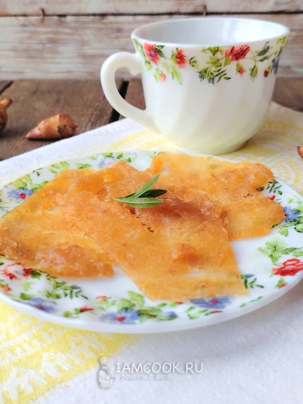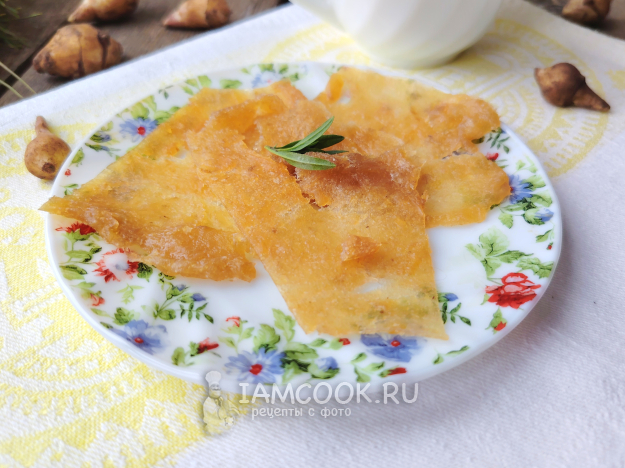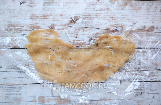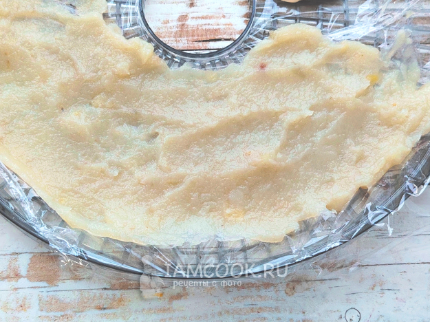 Противень сушилки затянуть пищевой пленкой или пергаментом, смазать маслом. Выложить тонким слоем пюре из топинамбура. Сушить при температуре 35-40 градусов 6-8 часов.
