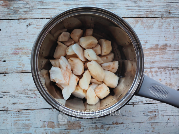 Корнеплод промыть, снять ножом кожицу, поместить овощ в кастрюлю, влить немного воды и потушить топинамбур до мягкости. Ему для готовности достаточно 20 минут на среднем огне. В кастрюле должна полностью выпариться жидкость. Готовность топинамбура можно проверить кончиком ножа, он должен легко войти в плод.