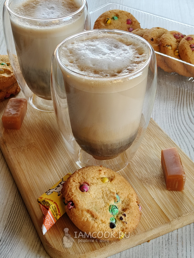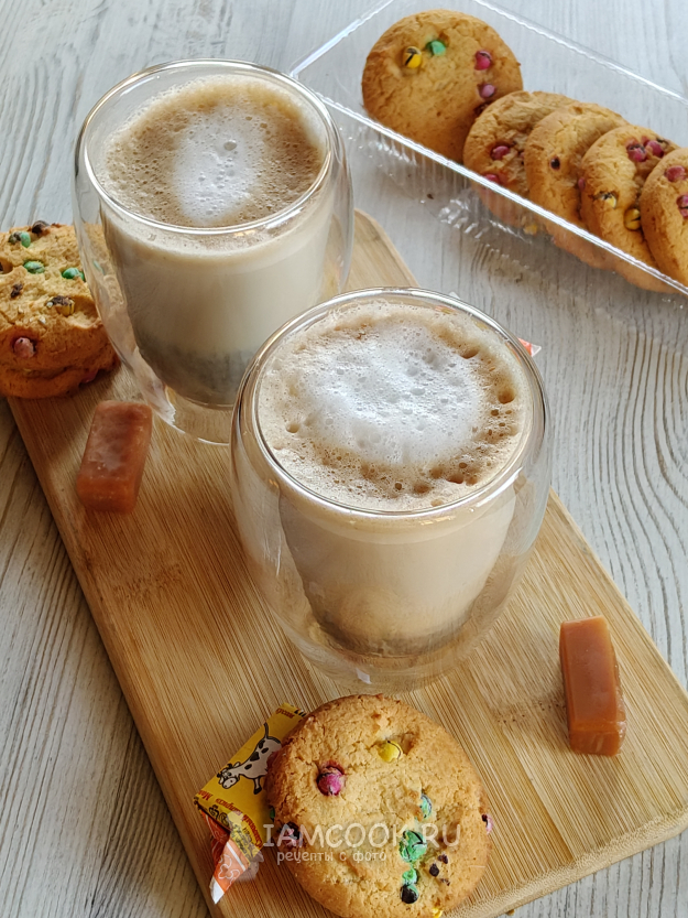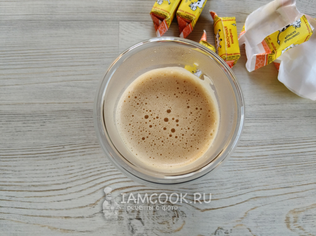 Кофе с конфетой «Коровка» в интернете готовится так: размять в кружке конфету, добавить растворимый кофе по вкусу и залить всё это горячим молоком, перемешать.