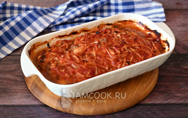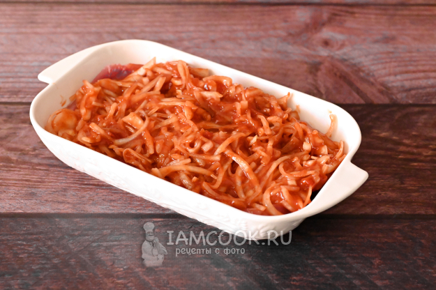 Примечание. Можно перемешать мясо с луком и кетчупом и запекать вперемешку, так тоже будет вкусно. Более того, можно перемешанное с луком и кетчупом сырое мясо оставить в холодильнике на пару суток, если вы хотите подготовиться к празднику заранее.