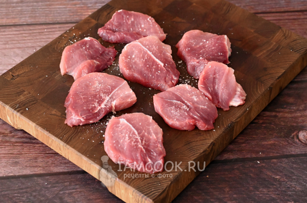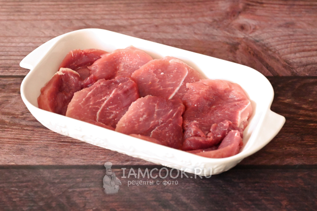 Мясо нарежьте на кусочки. В этот раз лопатку я нарезала на стейки. Но можно нарезать просто крупными кубиками.
