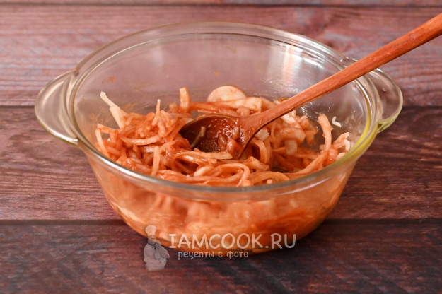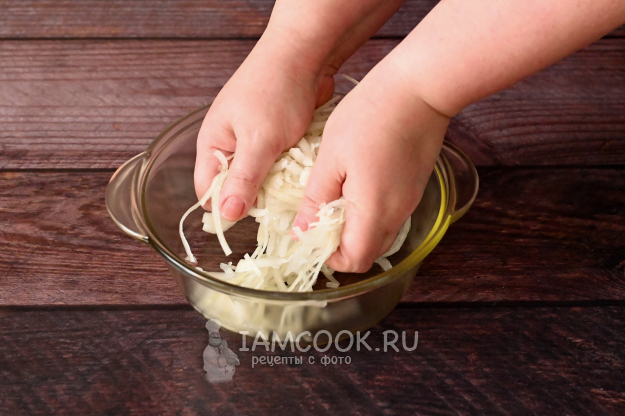 Хорошенько помните лук руками, чтобы он выпустил сок.