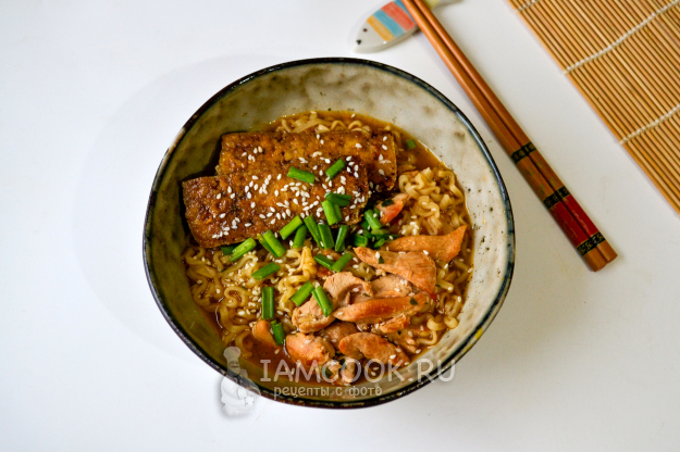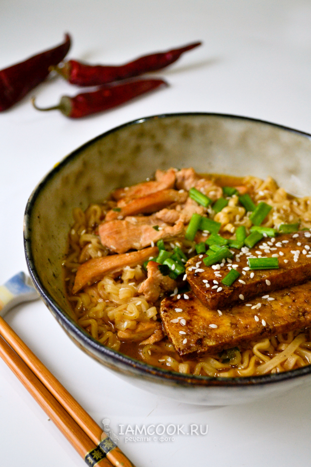 Рамен с курицей и сыром готов. Подавайте рамен горячим, с обжаренным тофу, зеленым луком и семенами кунжута.