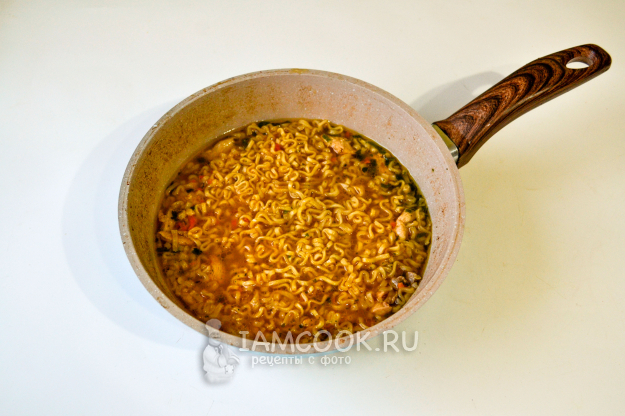 Доведите до кипения, закройте сковороду крышкой и снимите с огня. Через 4-5 минут лапша будет готова.