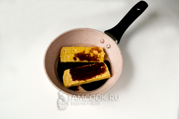 Обжарьте тофу до золотистого цвета, переверните на другую сторону.