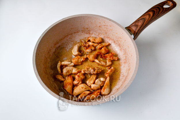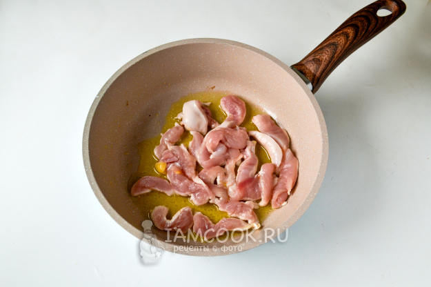 Разогрейте сковороду с растительным маслом и положите нарезанное куриное мясо.